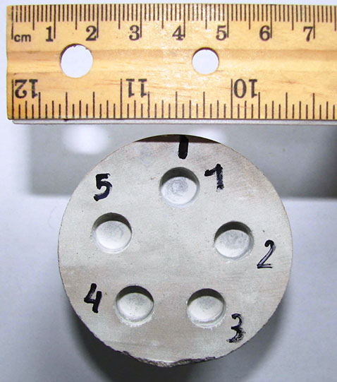 Rock specimen after performing the test: the Sievers' J-Value (SJ) coefficient is obtained from the average of the depth measurements of the five holes, useful for characterizing the drillability of a rock.