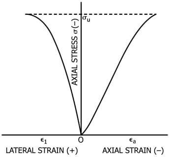 Representative graph of the deformation behavior of a rock subjected to uniaxial compression. This graph, known as the stress-strain curve, is generated only with the Uniaxial Compression Test – Method D (Source: ASTM D7012).