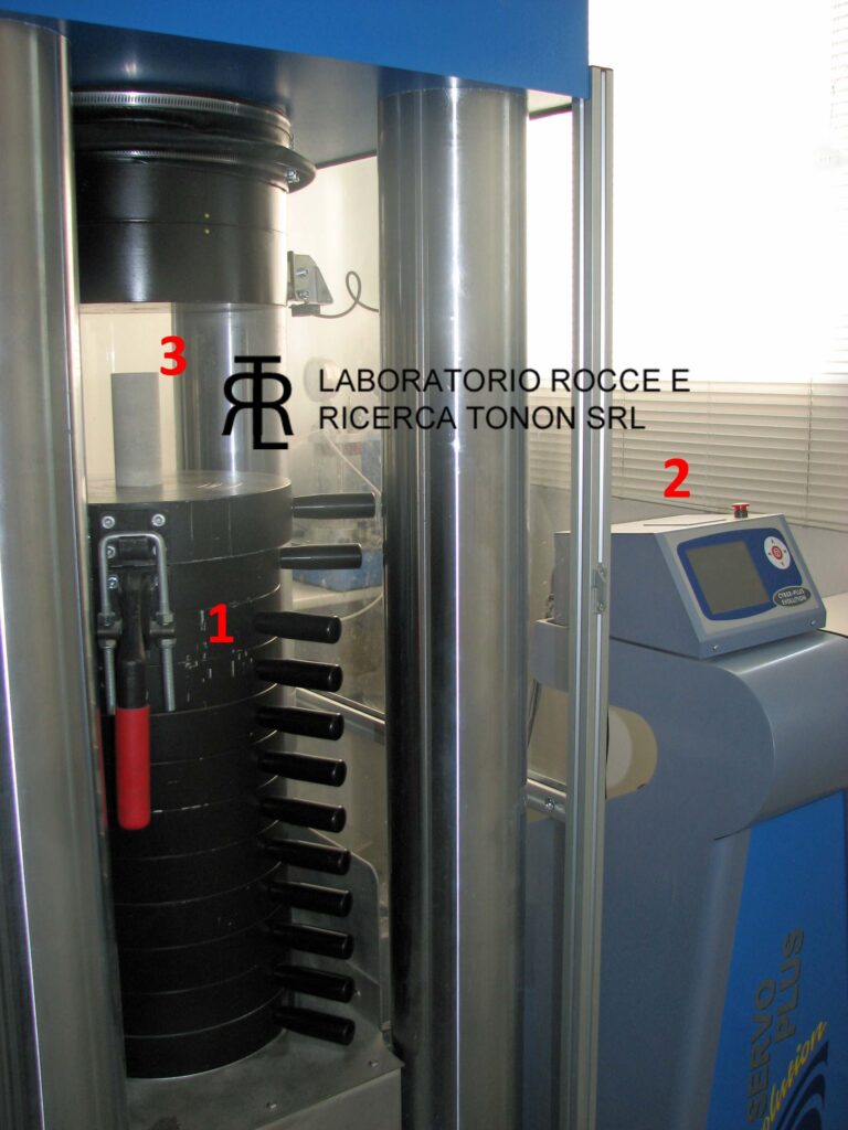 Apparatus for carrying out single-axis tests, present at the Tonon Rocks and Research Laboratory: (1) plate system operated by an automatic pneumatic system for load application; (2) control unit and setting of the test parameters; (3) specimen ready for the Uniaxial Test – Method C (Source: Laboratorio Rocce e Ricerca Tonon, srl).
