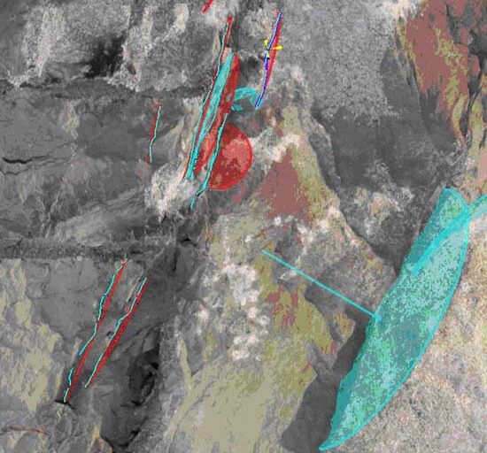 Here is a typical example of a fracture cluster: the scale is about 1 m. The trace-digitized fractures are in red, the plane-digitized fractures are in cyan. Typically, water flow concentrates at fracture clusters. By documenting these clusters one knows exactly where these clusters were encountered during construction (e.g., if in the future an anomalous water ingress is observed), and their characterization (including geostatistics and Dershowitz’s PIJ system (https://link.springer.com/article/10.1007/BF01047389) allows one to refine the fracture modelling (e.g., by using stochastic, geostatistical, and fractal models) prepared at the design stage. Such an improved model can then be used for groundwater inflow, fluid flow, or contaminant migration predictions. Indeed, any type of scan line may be traced on the rock walls, including circular scanlines that provide unbiased data (e.g., M. Mauldon, J. G. Mauldon Fracture sampling on a cylinder: From scanlines to boreholes and tunnels. Rock Mechanics and Rock Engineering, 30, 129-144, 1997 http://link.springer.com/article/10.1007/BF01047389). Just imagine tracing several circular scanlines on a vertical face when tied up with ropes and harness!