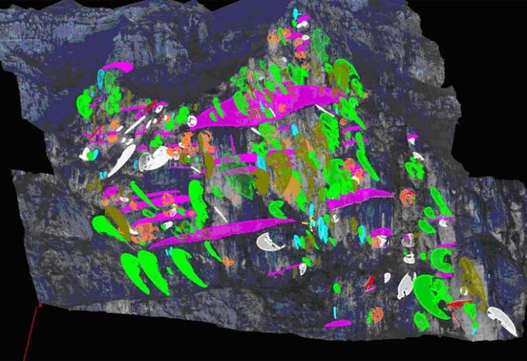 Here is an example of a rock face located 1.8 to 2.5 km (1.1 to 1.5 mi) from the camera stations. The objective was to determine not only the fracture sets, but also the size of the rock blocks on the rock face; indeed, this study was necessary to then generate rock blocks for a rockfall simulation. In these cases, not only is it necessary to identify a sufficient number of fractures: it is necessary to digitize ALL fractures because otherwise the determination of the block size will be incorrect. This rules out the use of LiDAR because fracture traces cannot be correctly identified in LiDAR data. When the fractures have been digitized as interpolating disks of different colours based on their fracture set as seen above, Tonon USA gains a fair amount of insight into the rock mass by rotating, zooming, panning, and examining the 3-D model textured with high resolution pictures. Likewise, fracture spacing measurements are carried out directly on the 3D model. Although the engineering-geology field work remains necessary, this technology may complement the field work as follows: